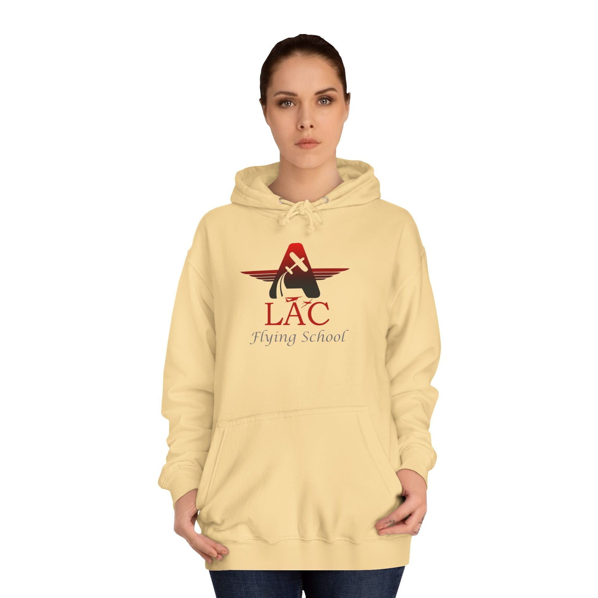 This LAC Flying School Logo Hoodie gives off a retro and collegiate vibe, perfect for aviation enthusiasts or those who appreciate vintage-inspired designs. It's ideal for casual wear during chilly days, making it a versatile addition to any wardrobe. This hoodie is relevant for back-to-school season, aviation-themed parties, and casual gatherings.