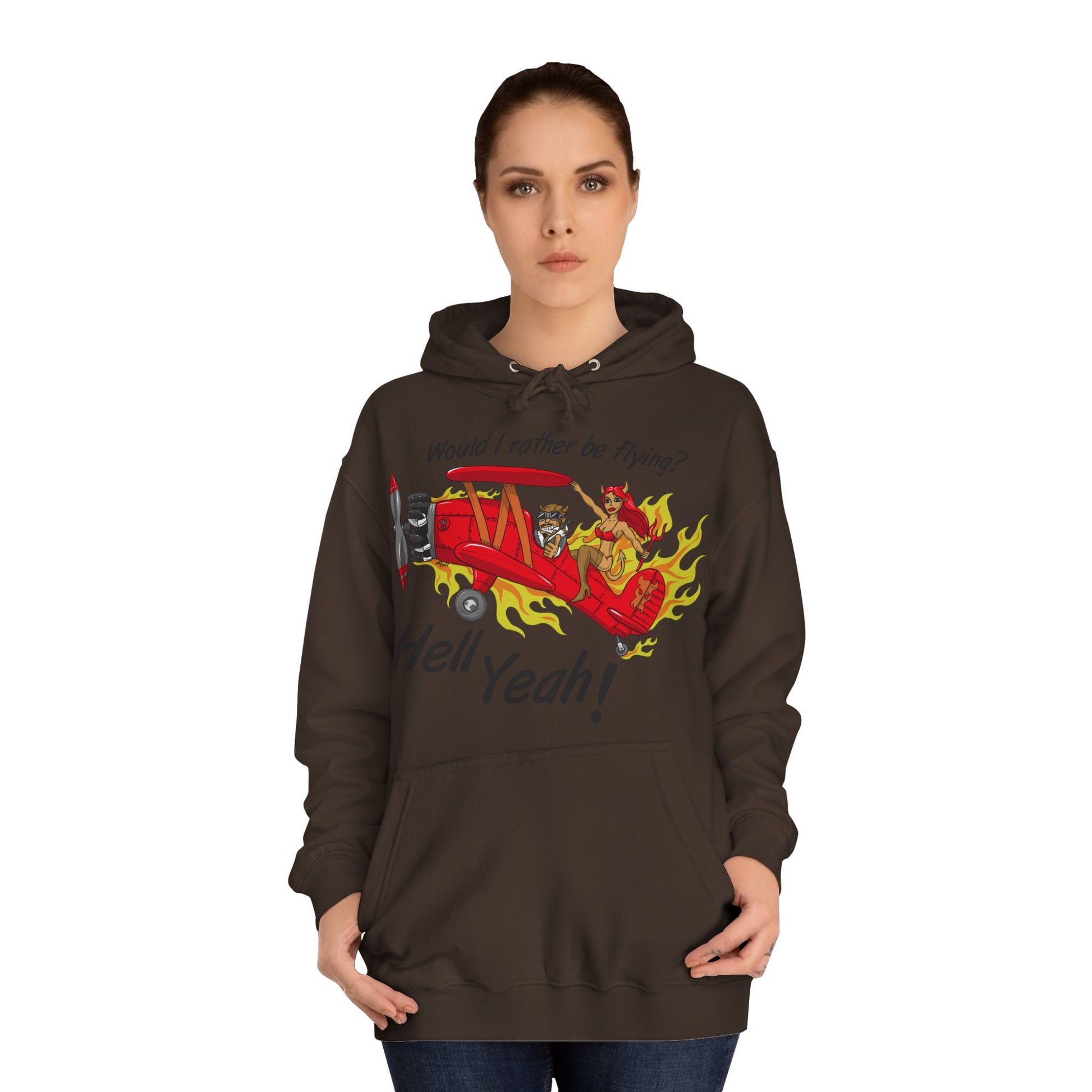 This hoodie carries a cheeky burst of adrenaline — a vintage red biplane skidding through flames with a grinning pilot and the bold line “Hell Yeah!” above. It feels like a laugh shared after a reckless adventure: warm, roomy, and unapologetically loud. The soft, medium-heavy fabric and loose cut make it an easy layer for late-night bonfires, road trips, or studio sessions. Wear it when you want to announce your mood without saying much. The kangaroo pocket shelters cold hands and small essentials while the adjustable hood keeps the wind off when you’re chasing sunsets or crowds. Built to hold shape with side seams and a tear-away label, it’s made for people who live a little louder and move a little freer.
