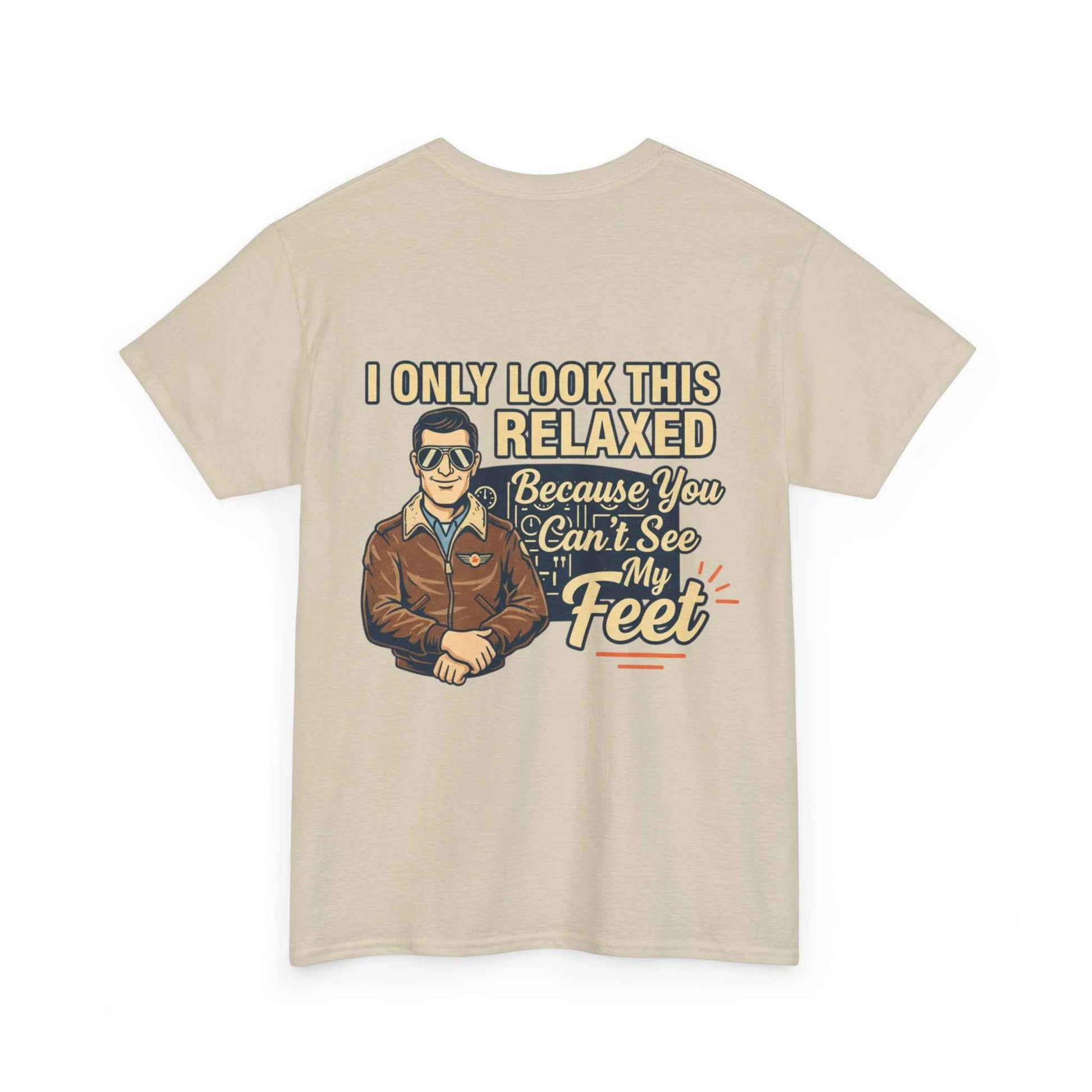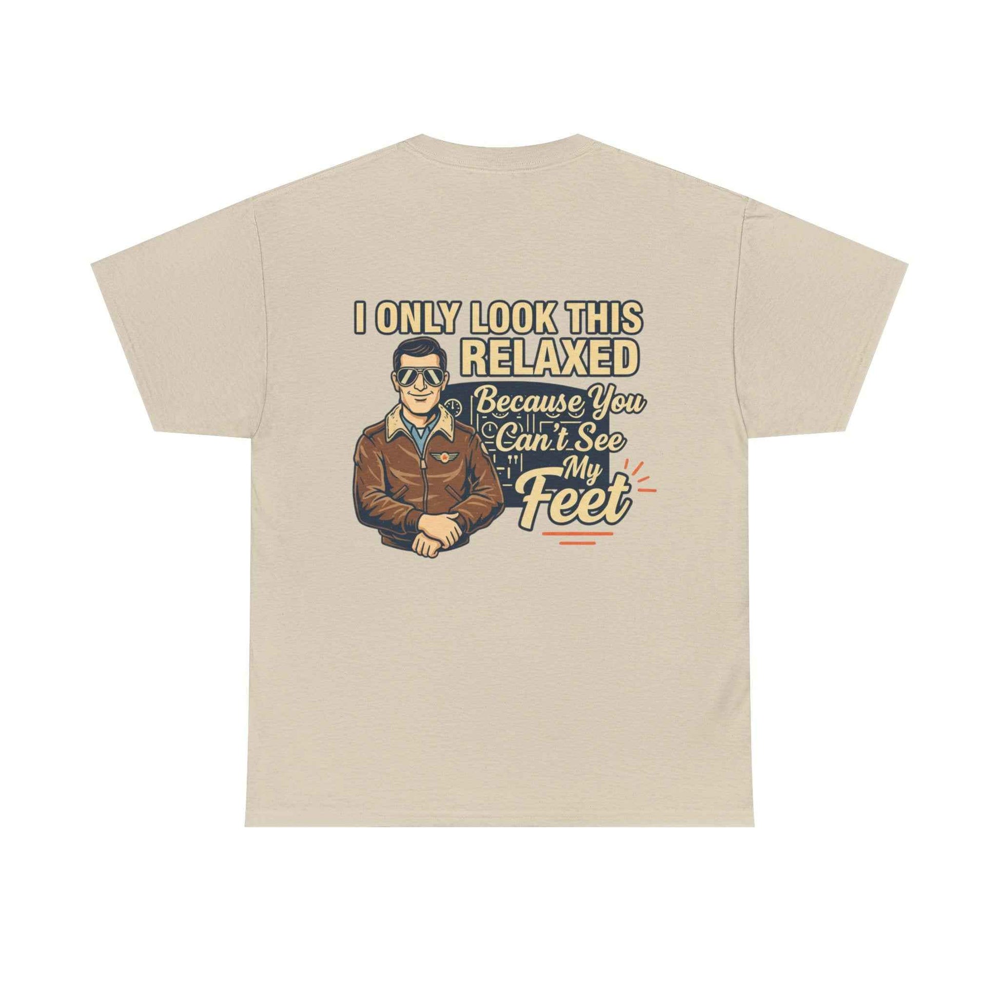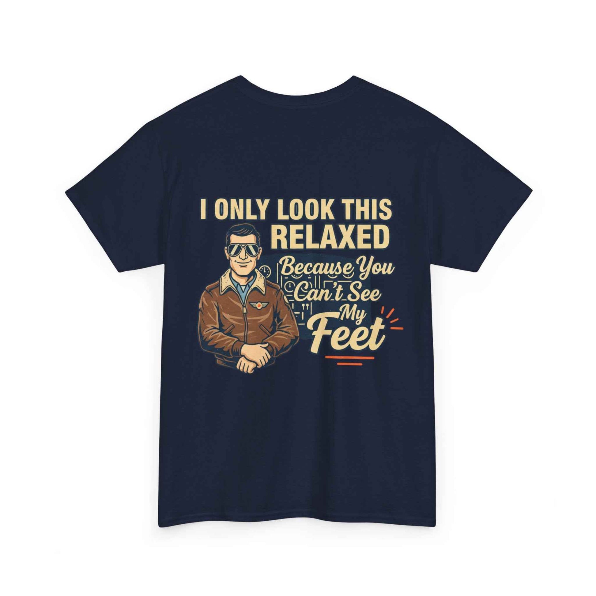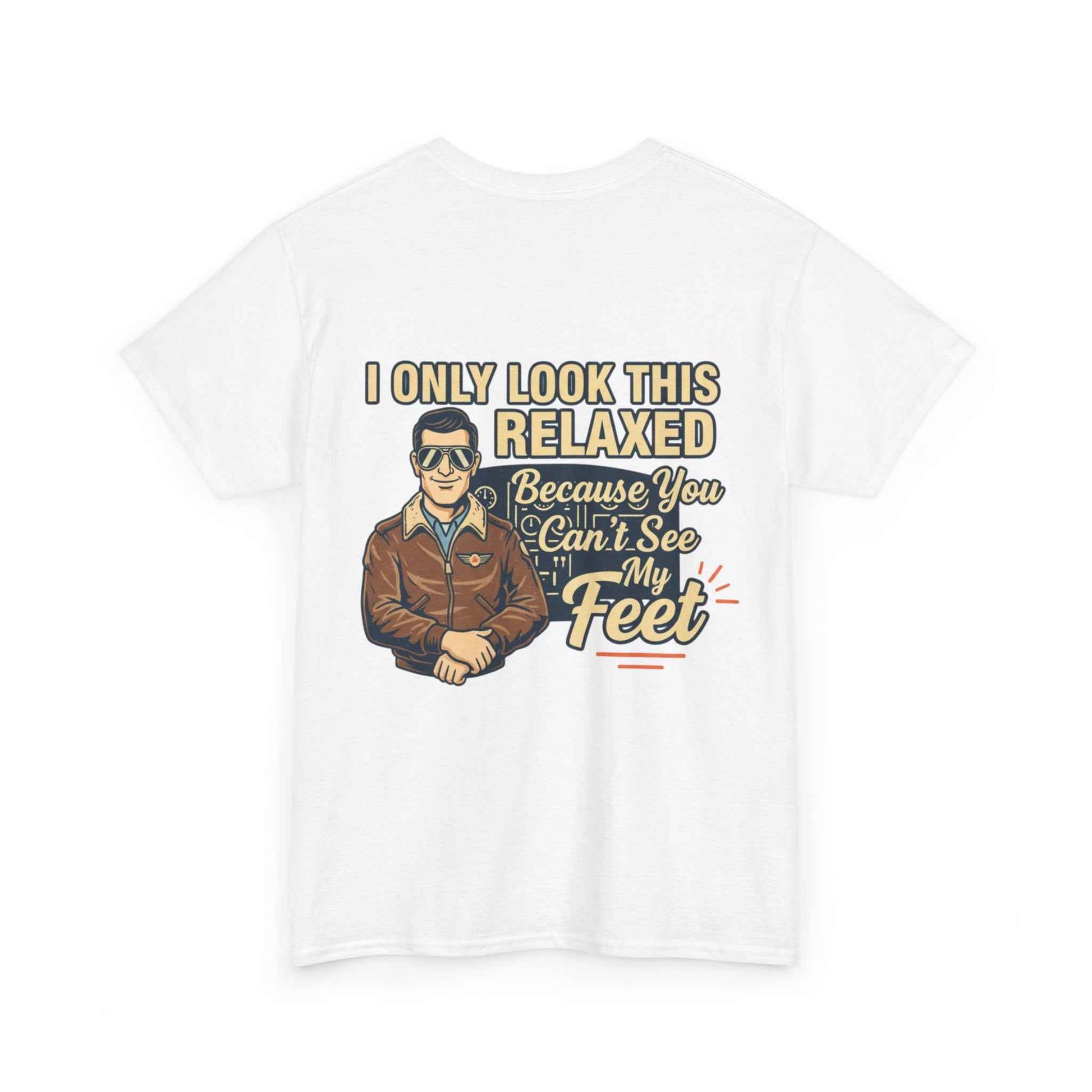 A laid-back, vintage-style tee that speaks to pilots, aviators, and anyone who loves sky-bound nostalgia. The soft white cotton keeps the retro artwork feeling crisp and wearable. Front-chest shows a small emblematic pilot illustration; the back features a larger, characterful design with cheeky lettering that reads “I only look this relaxed because you can’t see my feet.” It’s light, breathable, and built to last—great for long hangar days, weekend flights, or casual nights at the local aviation meetup. The classic crewneck and relaxed cut let you layer a flight jacket or wear it solo, while the tear-away label and sturdy collar keep comfort front and center. This tee ages well, softening with wear while keeping the print detail intact.