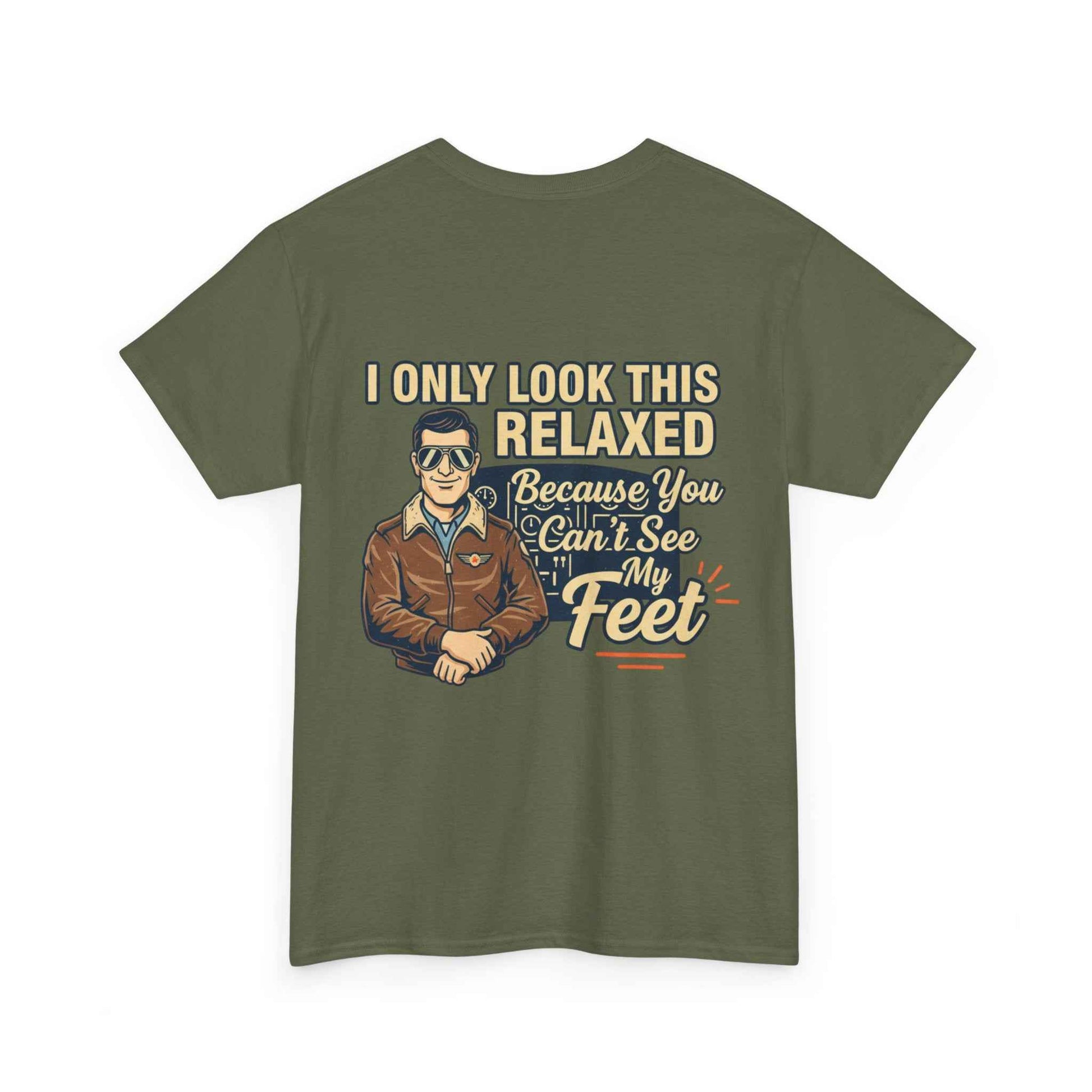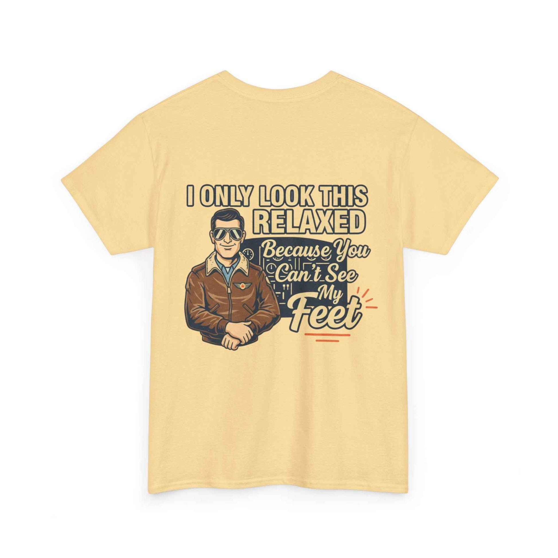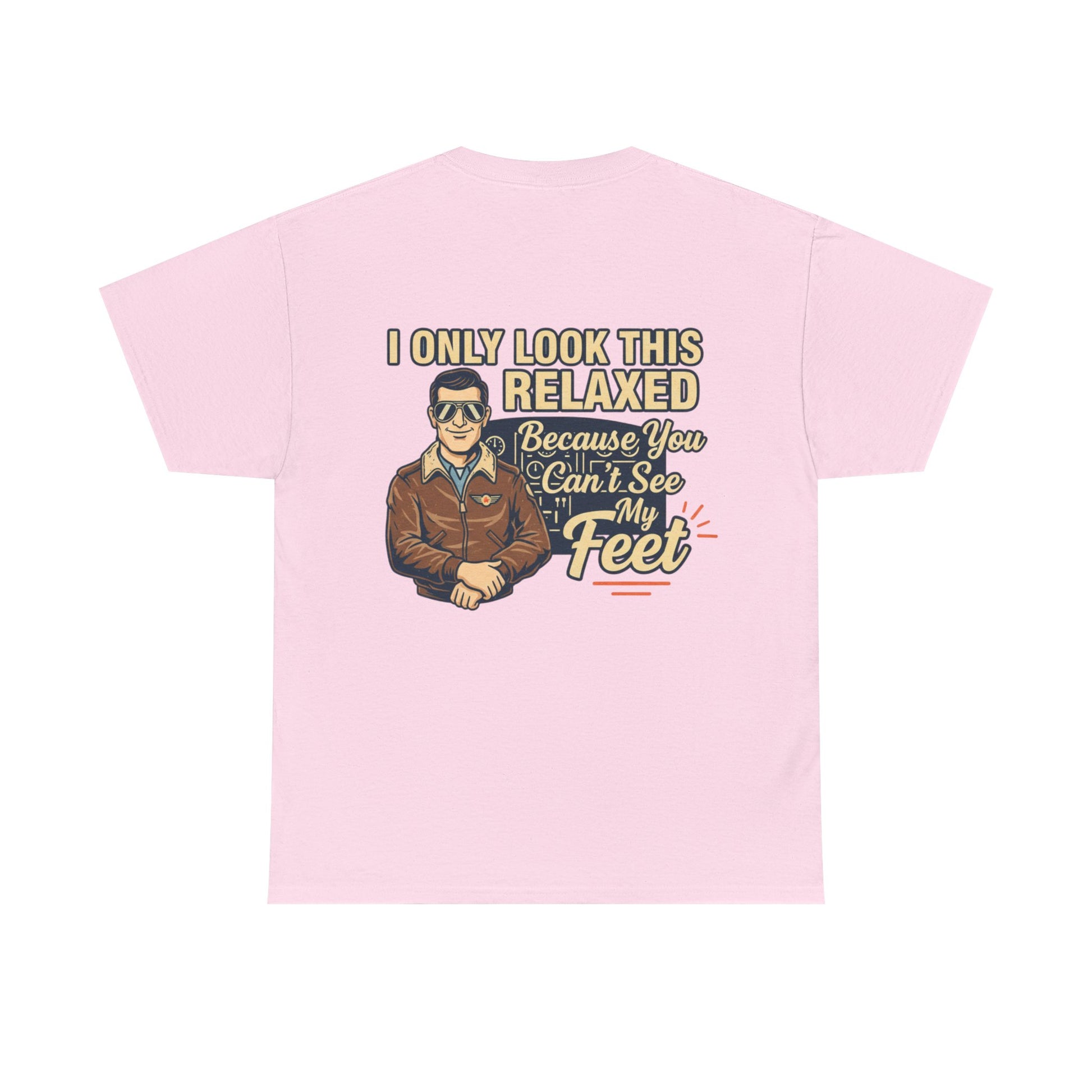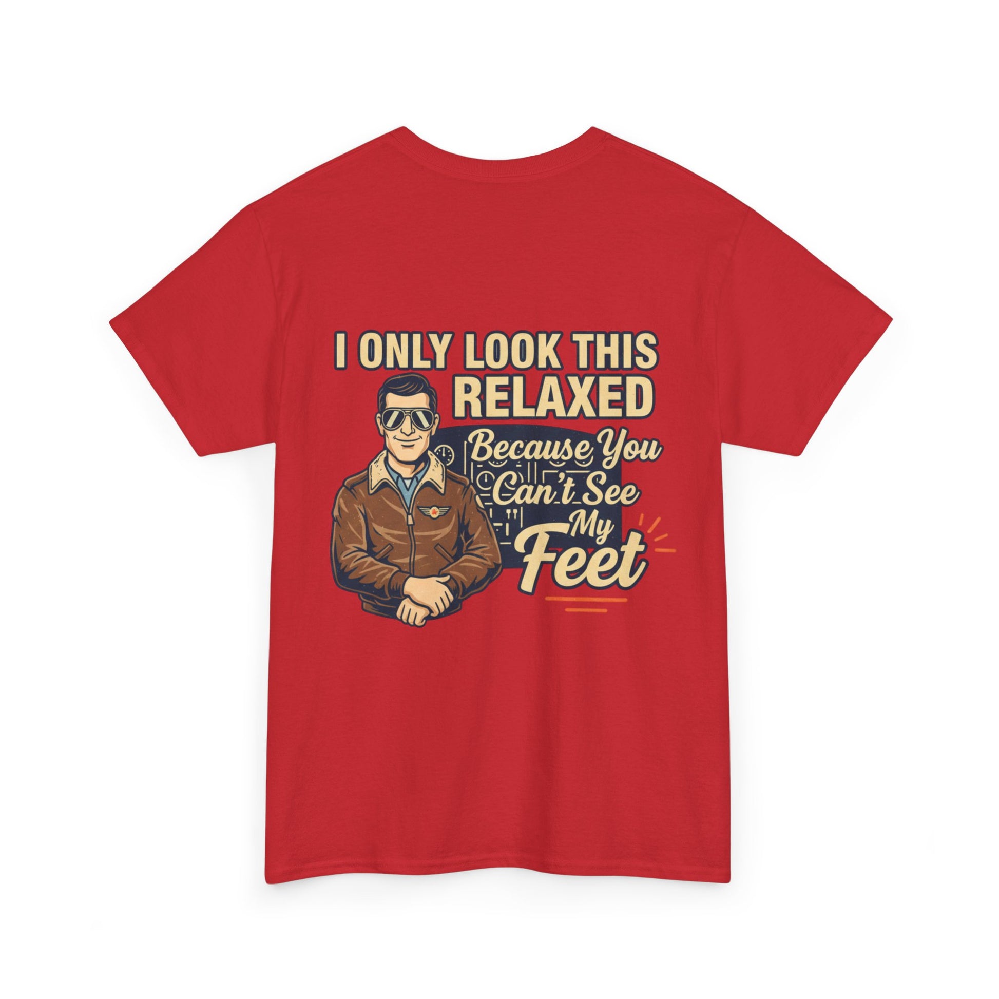 A laid-back, vintage-style tee that speaks to pilots, aviators, and anyone who loves sky-bound nostalgia. The soft white cotton keeps the retro artwork feeling crisp and wearable. Front-chest shows a small emblematic pilot illustration; the back features a larger, characterful design with cheeky lettering that reads “I only look this relaxed because you can’t see my feet.” It’s light, breathable, and built to last—great for long hangar days, weekend flights, or casual nights at the local aviation meetup. The classic crewneck and relaxed cut let you layer a flight jacket or wear it solo, while the tear-away label and sturdy collar keep comfort front and center. This tee ages well, softening with wear while keeping the print detail intact.