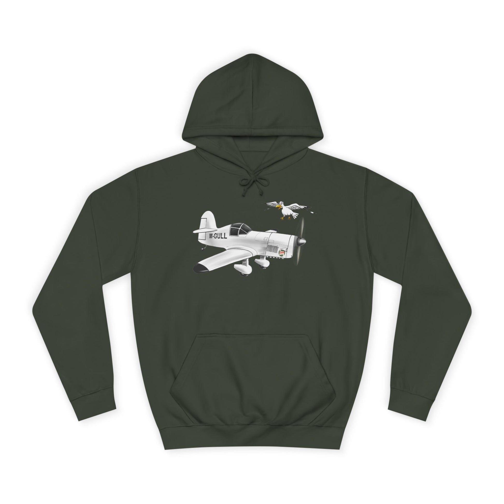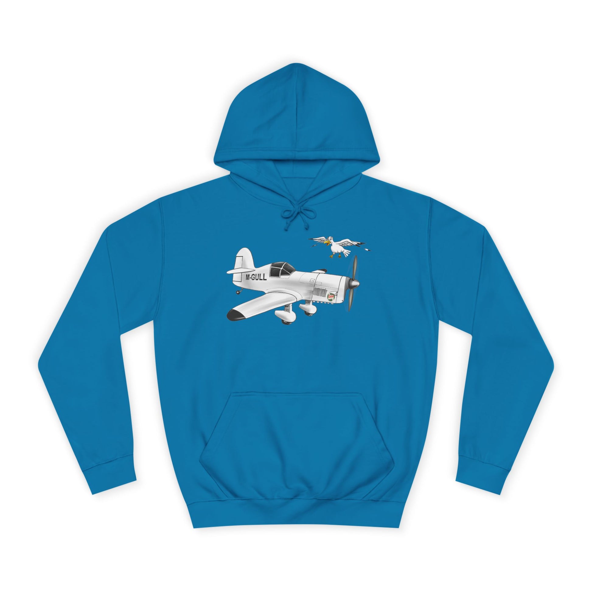 A unique Unisex College Hoodie featuring a hand-drawn design of the Historic Mew Gull Racing Aircraft. This medium heavy fabric hoodie is perfect for aviation enthusiasts and history buffs. It offers a loose fit, adjustable hood with drawstring, spacious kangaroo pouch pocket, and is made from a comfortable cotton-polyester blend. Ideal for casual wear or as a thoughtful gift for special occasions.